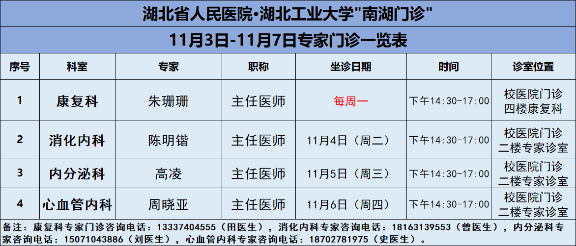 11月3日-11月7日,吉祥坊手机官网医院将邀请湖北省人民医院知名专家——康复科朱珊珊主任、消化内科陈明锴主任、内分泌科高凌主任、心内科周晓亚主任四位专家教授前来校医院坐诊(具体坐诊信息见下),请广大师生、周边居民持续关注南湖门诊专家坐诊信息,如有: