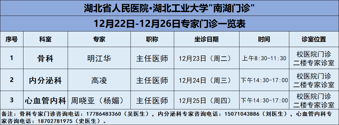 12月22日—12月26日,吉祥坊手机官网医院将邀请湖北省人民医院知名专家——骨科明江华主任、内分泌科高凌主任、心内科周晓亚主任三位专家教授前来校医院坐诊(具体坐诊信息见下)。请广大师生、周边居民持续关注南湖门诊专家坐诊信息,如有: