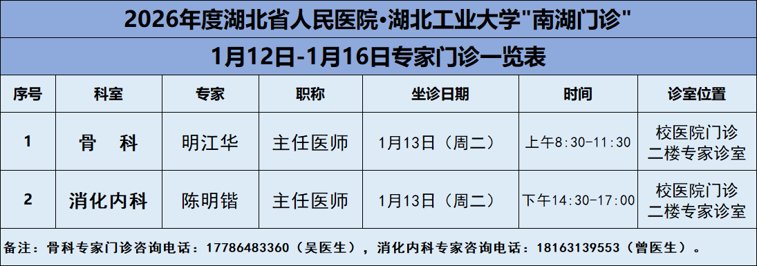 2026年1月12日—1月16日,吉祥坊手机官网医院将邀请湖北省人民医院知名专家——骨科明江华主任、消化内科陈明锴主任两位专家教授前来校医院坐诊(具体坐诊信息见下)。请广大师生、周边居民持续关注南湖门诊专家坐诊信息,如有: