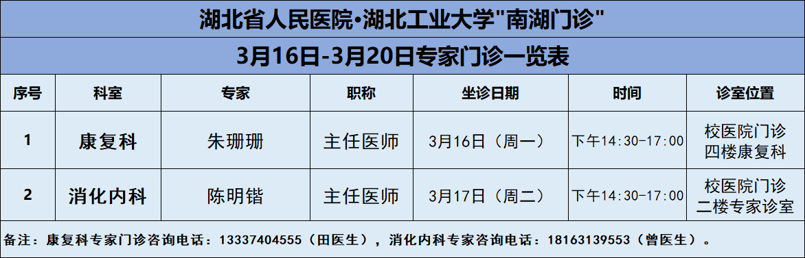 3月16日-3月20日,吉祥坊手机官网医院将邀请湖北省人民医院知名专家——康复科朱珊珊主任、消化内科陈明锴主任两位专家教授前来校医院坐诊(具体坐诊信息见下),请广大师生、周边居民持续关注南湖门诊专家坐诊信息,如有: