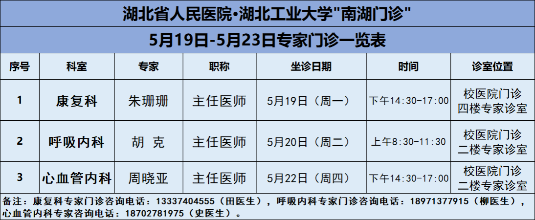 5月19日-23日,吉祥坊手机官网医院将邀请湖北省人民医院知名专家——康复科朱珊珊主任、呼吸内科胡克主任、心内科周晓亚主任三位专家教授前来校医院坐诊(具体坐诊信息见下),请广大师生、周边居民持续关注南湖门诊专家坐诊信息,如有: