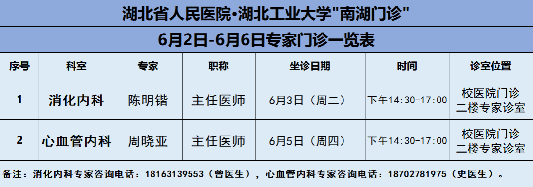 6月2日-6月6日,吉祥坊手机官网医院将邀请湖北省人民医院知名专家——消化内科陈明锴主任、心血管内科周晓亚主任两位专家教授前来校医院坐诊(具体坐诊信息见下),请广大师生、周边居民持续关注南湖门诊专家坐诊信息,如有: