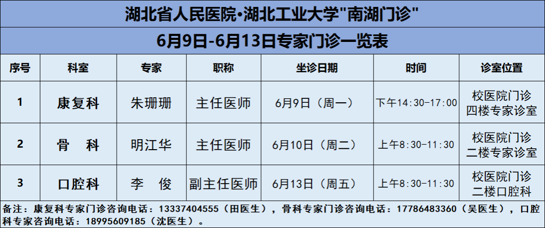 6月9日-6月13日,吉祥坊手机官网医院将邀请湖北省人民医院知名专家——康复科朱珊珊主任、骨科明江华主任、口腔科李俊副主任三位专家教授前来校医院坐诊(具体坐诊信息见下),请广大师生、周边居民持续关注南湖门诊专家坐诊信息,如有: