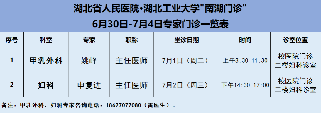 6月30日-7月4日,吉祥坊手机官网医院将邀请湖北省人民医院知名专家——甲乳外科姚峰主任、妇科申复进主任两位专家教授前来校医院坐诊(具体坐诊信息见下),请广大师生、周边居民持续关注南湖门诊专家坐诊信息,如有: