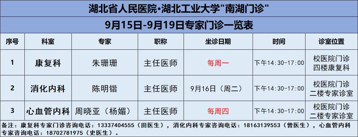 9月15日-9月19日,吉祥坊手机官网医院将邀请湖北省人民医院知名专家——康复科朱珊珊主任、消化内科陈明锴主任、心内科周晓亚主任三位专家教授前来校医院坐诊(具体坐诊信息见下),请广大师生、周边居民持续关注南湖门诊专家坐诊信息,如有: