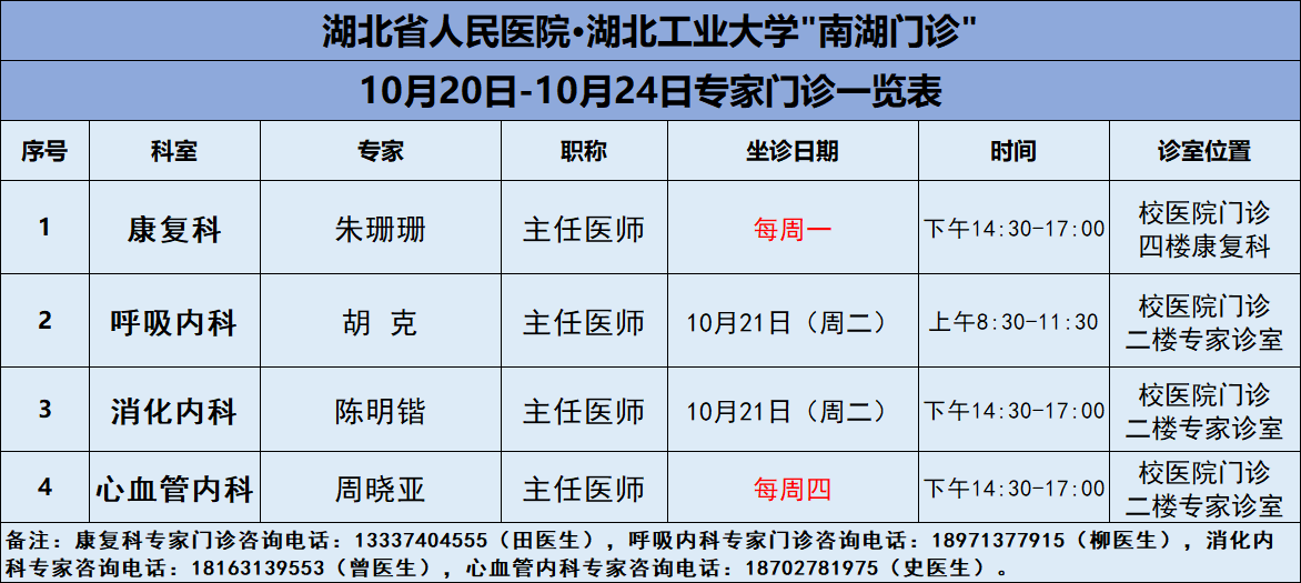 10月20日-10月24日,吉祥坊手机官网医院将邀请湖北省人民医院知名专家——康复科朱珊珊主任、呼吸内科胡克主任、消化内科陈明锴主任、心内科周晓亚主任四位专家教授前来校医院坐诊(具体坐诊信息见下),请广大师生、周边居民持续关注南湖门诊专家坐诊信息,如有: