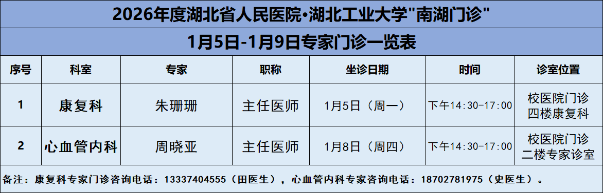 2026年1月5日—1月9日,吉祥坊手机官网医院将邀请湖北省人民医院知名专家——康复科朱珊珊主任、心内科周晓亚主任两位专家教授前来校医院坐诊(具体坐诊信息见下)。请广大师生、周边居民持续关注南湖门诊专家坐诊信息,如有: