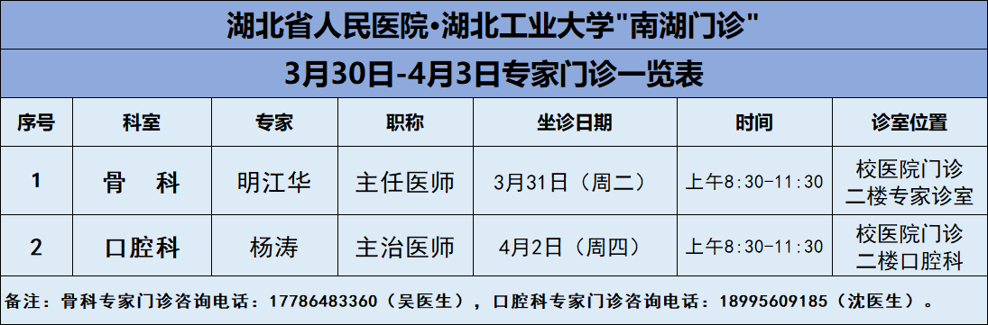 3月30日-4月3日,吉祥坊手机官网医院将邀请湖北省人民医院知名专家——骨科明江华主任、口腔科杨涛医生两位专家教授前来校医院坐诊(具体坐诊信息见下),请广大师生、周边居民持续关注南湖门诊专家坐诊信息,如有: