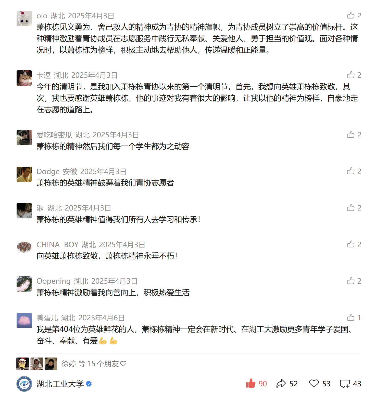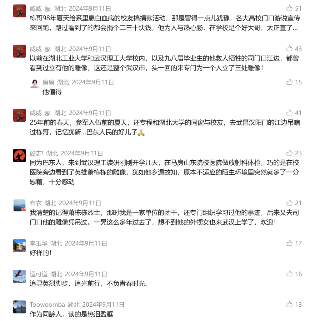 网友“R·L·W·HG”留言,“湖工大的校史馆也有一座萧栋栋的雕像,英雄的事迹永远不会随着时间被遗忘或褪色,萧栋栋舍己为人的英雄精神会被一代代湖工人铭记和颂扬。”
